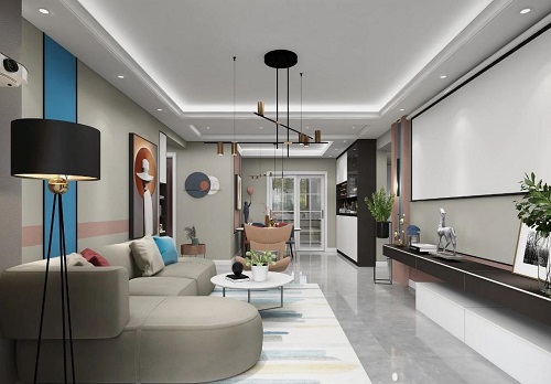客廳以輕柔的色彩暈染開,一切色彩的比例、線條被安排得剛剛好,冷靜而克制的基路伯煙灰色邂逅溫柔治愈的皮粉色,是驚喜亦是藝術(shù)相迎,再以天空藍(lán)點(diǎn)綴,整個(gè)空間層次感分明,溫馨舒適。