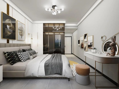 主臥玻璃柜門的衣柜,線條裝飾整個(gè)空間,大氣蓬勃的感覺,梳妝臺(tái)、床頭柜等家具應(yīng)有盡有,符合年輕人追求品質(zhì)生活的設(shè)置。