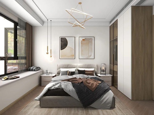 次臥比較溫馨,原木系衣柜,與木地板相配,床頭柜上臺(tái)燈,吊燈的設(shè)計(jì),在暖光的直射下,讓臥室變得格外的溫馨。